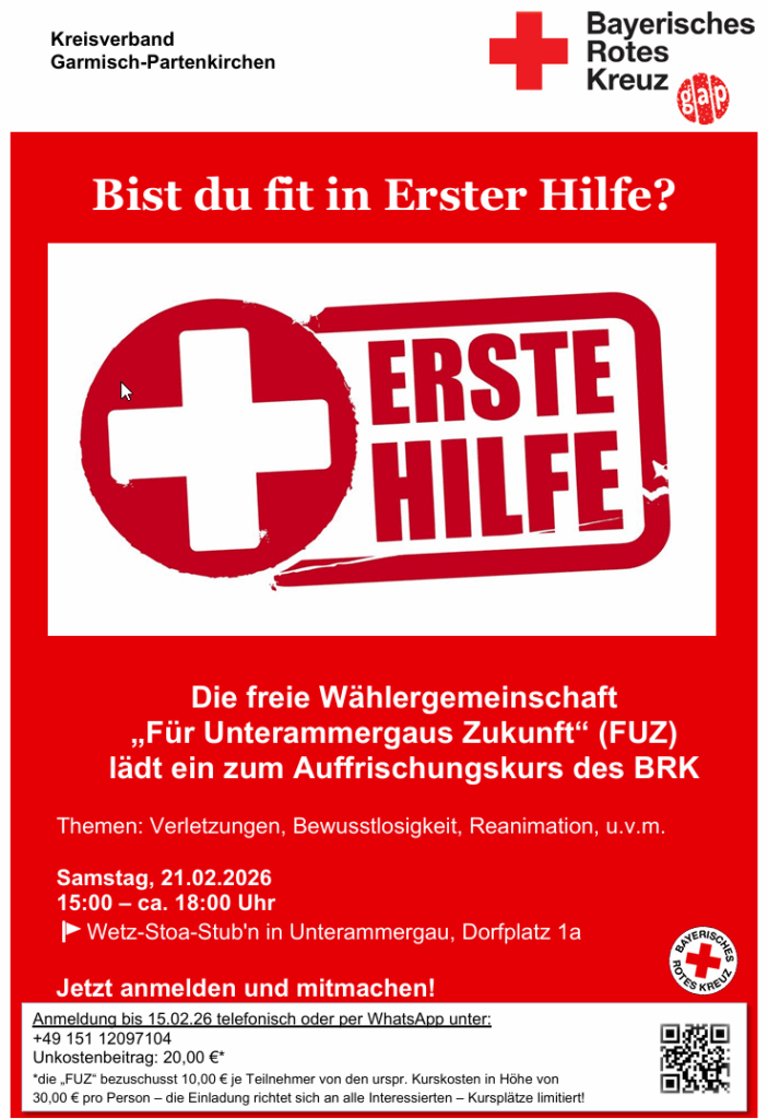 Die freie Wählergemeinschaft „Für Unterammergaus Zukunft“ (FUZ) lädt ein zum Auffrischungskurs des BRK Themen: Verletzungen, Bewusstlosigkeit, Reanimation, u.v.m.